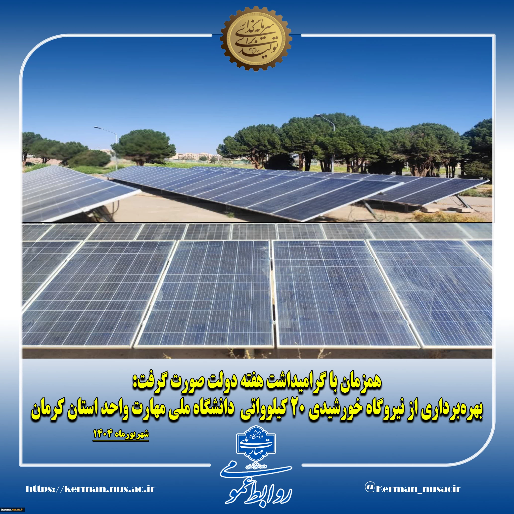 امتیاز دهید : همزمان با گرامیداشت هفته دولت صورت گرفت: بهرهبرداری از نیروگاه خورشیدی ۲۰ کیلوواتی دانشگاه ملی مهارت واحد استان کرمان 2 سهشنبه 4 شهریور 1404 ساعت 8:16
