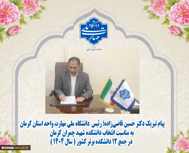 امتیاز دهید : پیام تبریک دکتر حسین قاضی زاده؛ رئیس دانشگاه ملی مهارت واحد استان کرمان به مناسبت انتخاب دانشکده شهید چمران کرمان در جمع ۱۲ دانشکده برتر کشور ( سال ۱۴۰۴ ) 2 سهشنبه 18 شهریور 1404 ساعت 12:35